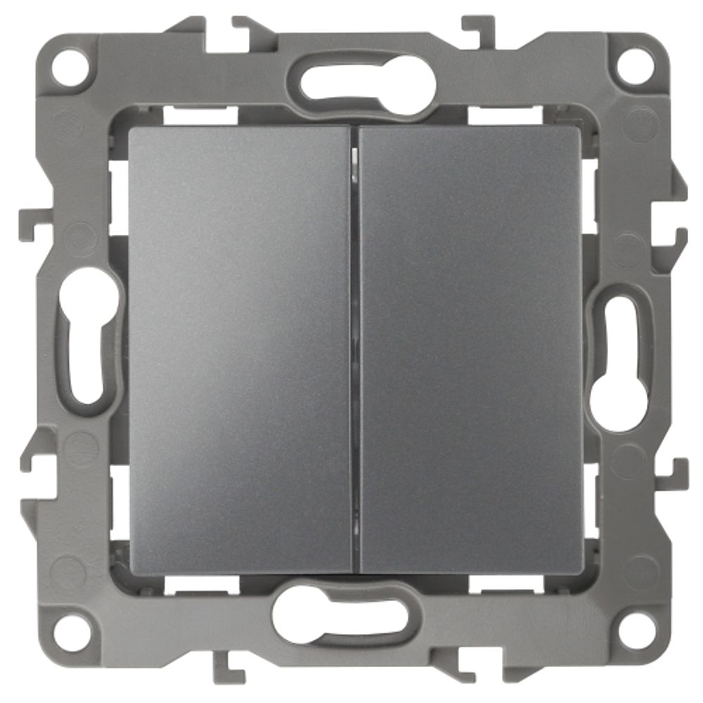 Выключатель 2-клавишный серии Эра 12 скрытой установки механизм цвет графит 12-1104-12. Номинальные характеристики 10А 250В . Сделан из поликарбоната, оснащёно автоматическими клеммами для быстрй и надёжной фиксации жил кабеля в механиме. Парные клеммы обеспечивают соединение шлейфом. Монтаж в подрозетник производится и на лапки, и на винты. Рамки приобретаются отдельно. Рамки Эра 12: 1 пост 12-5001-хх, 2 поста 12-5002-хх, 3 поста 12-5003-хх, 4 поста 12-5004-хх, 5 постов 12-5005-хх. Рамки Эра 12 Сатин: 1 пост 12-5101-хх, 2 поста 12-5102-хх, 3 поста 12-5103-хх, 4 поста 12-5104-хх, 5 постов - 12-5105-хх (хх - код цвета: 01-белый, 02-слоновая кость, 03-алюминий, 04-шампань, 05-антрацит, 06-чёрный, 07-ольха(белёный дуб-сатин), 08-вишня, 09-дуб, 10-венге, 11-сосна, 21-жёлтый, 22-оранжевый, 23-красный, 24-охра, 25-бордо, 26-лайм, 27-зелёный, 28-голубой, 29-синий).