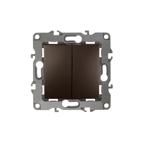 Выключатель 2-клавишный серии Эра 12 скрытой установки механизм цвет бронза 12-1104-13. Номинальные характеристики 10А 250В . Сделан из поликарбоната, оснащёно автоматическими клеммами для быстрй и надёжной фиксации жил кабеля в механиме. Парные клеммы обеспечивают соединение шлейфом. Монтаж в подрозетник производится и на лапки, и на винты. Рамки приобретаются отдельно. Рамки Эра 12: 1 пост 12-5001-хх, 2 поста 12-5002-хх, 3 поста 12-5003-хх, 4 поста 12-5004-хх, 5 постов 12-5005-хх. Рамки Эра 12 Сатин: 1 пост 12-5101-хх, 2 поста 12-5102-хх, 3 поста 12-5103-хх, 4 поста 12-5104-хх, 5 постов - 12-5105-хх (хх - код цвета: 01-белый, 02-слоновая кость, 03-алюминий, 04-шампань, 05-антрацит, 06-чёрный, 07-ольха(белёный дуб-сатин), 08-вишня, 09-дуб, 10-венге, 11-сосна, 21-жёлтый, 22-оранжевый, 23-красный, 24-охра, 25-бордо, 26-лайм, 27-зелёный, 28-голубой, 29-синий).
