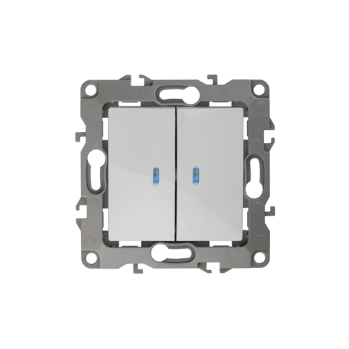 Выключатель 2-клавишный с подсветкой серии Эра 12 скрыт.установки механизм цвет белый 12-1105-01. Номинальные характеристики 10А 250В . Сделан из поликарбоната, оснащёно автоматическими клеммами для быстрй и надёжной фиксации жил кабеля в механиме. Парные клеммы обеспечивают соединение шлейфом. Монтаж в подрозетник производится и на лапки, и на винты. Рамки приобретаются отдельно. Рамки Эра 12: 1 пост 12-5001-хх, 2 поста 12-5002-хх, 3 поста 12-5003-хх, 4 поста 12-5004-хх, 5 постов 12-5005-хх. Рамки Эра 12 Сатин: 1 пост 12-5101-хх, 2 поста 12-5102-хх, 3 поста 12-5103-хх, 4 поста 12-5104-хх, 5 постов - 12-5105-хх (хх - код цвета: 01-белый, 02-слоновая кость, 03-алюминий, 04-шампань, 05-антрацит, 06-чёрный, 07-ольха(белёный дуб-сатин), 08-вишня, 09-дуб, 10-венге, 11-сосна, 21-жёлтый, 22-оранжевый, 23-красный, 24-охра, 25-бордо, 26-лайм, 27-зелёный, 28-голубой, 29-синий).