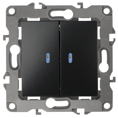 Выключатель 2-клавишный с подсветкой серии Эра 12 скрыт.установки механизм цвет антрацит 12-1105-05. Номинальные характеристики 10А 250В . Сделан из поликарбоната, оснащёно автоматическими клеммами для быстрй и надёжной фиксации жил кабеля в механиме. Парные клеммы обеспечивают соединение шлейфом. Монтаж в подрозетник производится и на лапки, и на винты. Рамки приобретаются отдельно. Рамки Эра 12: 1 пост 12-5001-хх, 2 поста 12-5002-хх, 3 поста 12-5003-хх, 4 поста 12-5004-хх, 5 постов 12-5005-хх. Рамки Эра 12 Сатин: 1 пост 12-5101-хх, 2 поста 12-5102-хх, 3 поста 12-5103-хх, 4 поста 12-5104-хх, 5 постов - 12-5105-хх (хх - код цвета: 01-белый, 02-слоновая кость, 03-алюминий, 04-шампань, 05-антрацит, 06-чёрный, 07-ольха(белёный дуб-сатин), 08-вишня, 09-дуб, 10-венге, 11-сосна, 21-жёлтый, 22-оранжевый, 23-красный, 24-охра, 25-бордо, 26-лайм, 27-зелёный, 28-голубой, 29-синий).