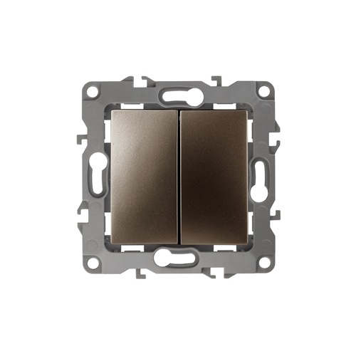 Выключатель 2-клавишный проходной серии Эра 12 скрытой установки механизм цвет бронза 12-1106-13. Номинальные характеристики 10А 250В . Сделан из поликарбоната, оснащёно автоматическими клеммами для быстрй и надёжной фиксации жил кабеля в механиме. Парные клеммы обеспечивают соединение шлейфом. Монтаж в подрозетник производится и на лапки, и на винты. Рамки приобретаются отдельно. Рамки Эра 12: 1 пост 12-5001-хх, 2 поста 12-5002-хх, 3 поста 12-5003-хх, 4 поста 12-5004-хх, 5 постов 12-5005-хх. Рамки Эра 12 Сатин: 1 пост 12-5101-хх, 2 поста 12-5102-хх, 3 поста 12-5103-хх, 4 поста 12-5104-хх, 5 постов - 12-5105-хх (хх - код цвета: 01-белый, 02-слоновая кость, 03-алюминий, 04-шампань, 05-антрацит, 06-чёрный, 07-ольха(белёный дуб-сатин), 08-вишня, 09-дуб, 10-венге, 11-сосна, 21-жёлтый, 22-оранжевый, 23-красный, 24-охра, 25-бордо, 26-лайм, 27-зелёный, 28-голубой, 29-синий).