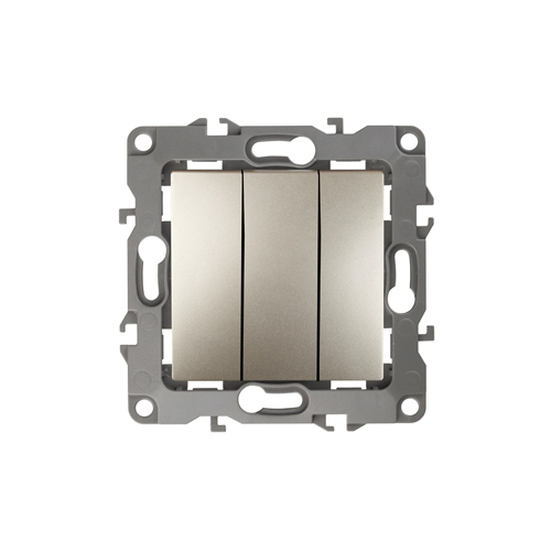 Выключатель 3-клавишный серии Эра 12 скрытой установки механизм цвет шампань 12-1107-04. Номинальные характеристики 10А 250В . Сделан из поликарбоната, оснащён винтовыми уникальными клеммами ЭКСПЕРТ для надёжной фиксации жил кабеля в механиме. Парные клеммы обеспечивают соединение шлейфом. Монтаж в подрозетник производится и на лапки, и на винты. Рамки приобретаются отдельно. Рамки Эра 12: 1 пост 12-5001-хх, 2 поста 12-5002-хх, 3 поста 12-5003-хх, 4 поста 12-5004-хх, 5 постов 12-5005-хх. Рамки Эра 12 Сатин: 1 пост 12-5101-хх, 2 поста 12-5102-хх, 3 поста 12-5103-хх, 4 поста 12-5104-хх, 5 постов - 12-5105-хх (хх - код цвета: 01-белый, 02-слоновая кость, 03-алюминий, 04-шампань, 05-антрацит, 06-чёрный, 07-ольха(белёный дуб-сатин), 08-вишня, 09-дуб, 10-венге, 11-сосна, 21-жёлтый, 22-оранжевый, 23-красный, 24-охра, 25-бордо, 26-лайм, 27-зелёный, 28-голубой, 29-синий).