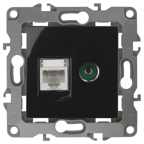 Розетка телевизионная + интернет серии Эра 12 скрытой установки механизм цвет чёрный 12-3110-06. Сделана из поликарбоната. Монтаж в подрозетник производится и на лапки, и на винты. Рамки приобретаются отдельно.