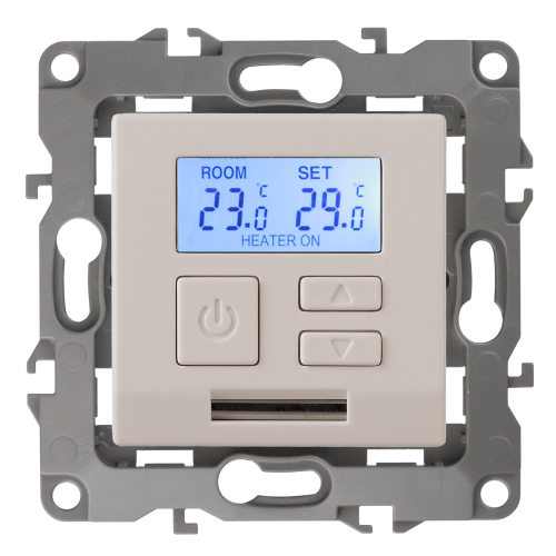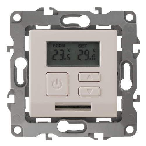 Терморегулятор теплый пол / отопление электронный серии Эра 12 СУ механизм цвет слоновая кость 12-4111-02. Номинальные характеристики 16А 230В. Сделана из поликарбоната. Монтаж в подрозетник производится и на лапки, и на винты. Рамки приобретаются отдельно. Рамки Эра 12: 1 пост 12-5001-хх, 2 поста 12-5002-хх, 3 поста 12-5003-хх, 4 поста 12-5004-хх, 5 постов 12-5005-хх. Рамки Эра 12 Сатин: 1 пост 12-5101-хх, 2 поста 12-5102-хх, 3 поста 12-5103-хх, 4 поста 12-5104-хх, 5 постов - 12-5105-хх (хх - код цвета: 01-белый, 02-слоновая кость, 03-алюминий, 04-шампань, 05-антрацит, 06-чёрный, 07-ольха(белёный дуб-сатин), 08-вишня, 09-дуб, 10-венге, 11-сосна, 21-жёлтый, 22-оранжевый, 23-красный, 24-охра, 25-бордо, 26-лайм, 27-зелёный, 28-голубой, 29-синий).