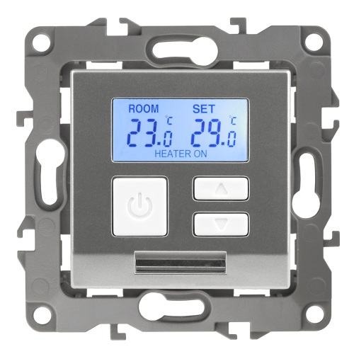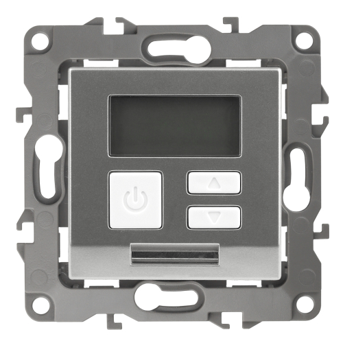 Терморегулятор теплый пол / отопление электронный серии Эра 12 СУ механизм цвет алюминий 12-4111-03. Номинальные характеристики 16А 230В. Сделана из поликарбоната. Монтаж в подрозетник производится и на лапки, и на винты. Рамки приобретаются отдельно. Рамки Эра 12: 1 пост 12-5001-хх, 2 поста 12-5002-хх, 3 поста 12-5003-хх, 4 поста 12-5004-хх, 5 постов 12-5005-хх. Рамки Эра 12 Сатин: 1 пост 12-5101-хх, 2 поста 12-5102-хх, 3 поста 12-5103-хх, 4 поста 12-5104-хх, 5 постов - 12-5105-хх (хх - код цвета: 01-белый, 02-слоновая кость, 03-алюминий, 04-шампань, 05-антрацит, 06-чёрный, 07-ольха(белёный дуб-сатин), 08-вишня, 09-дуб, 10-венге, 11-сосна, 21-жёлтый, 22-оранжевый, 23-красный, 24-охра, 25-бордо, 26-лайм, 27-зелёный, 28-голубой, 29-синий).