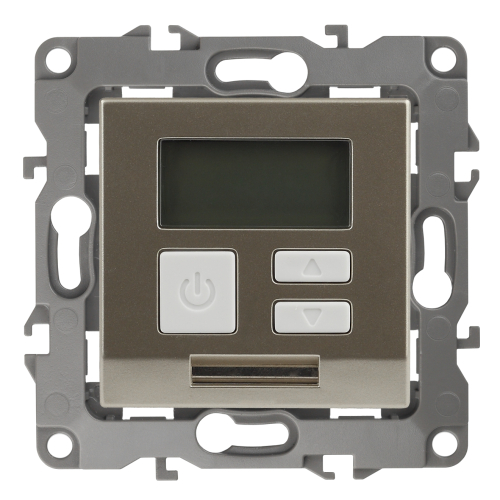 Терморегулятор теплый пол / отопление электронный серии Эра 12 СУ механизм цвет шампань 12-4111-04. Номинальные характеристики 16А 230В. Сделана из поликарбоната. Монтаж в подрозетник производится и на лапки, и на винты. Рамки приобретаются отдельно. Рамки Эра 12: 1 пост 12-5001-хх, 2 поста 12-5002-хх, 3 поста 12-5003-хх, 4 поста 12-5004-хх, 5 постов 12-5005-хх. Рамки Эра 12 Сатин: 1 пост 12-5101-хх, 2 поста 12-5102-хх, 3 поста 12-5103-хх, 4 поста 12-5104-хх, 5 постов - 12-5105-хх (хх - код цвета: 01-белый, 02-слоновая кость, 03-алюминий, 04-шампань, 05-антрацит, 06-чёрный, 07-ольха(белёный дуб-сатин), 08-вишня, 09-дуб, 10-венге, 11-сосна, 21-жёлтый, 22-оранжевый, 23-красный, 24-охра, 25-бордо, 26-лайм, 27-зелёный, 28-голубой, 29-синий).