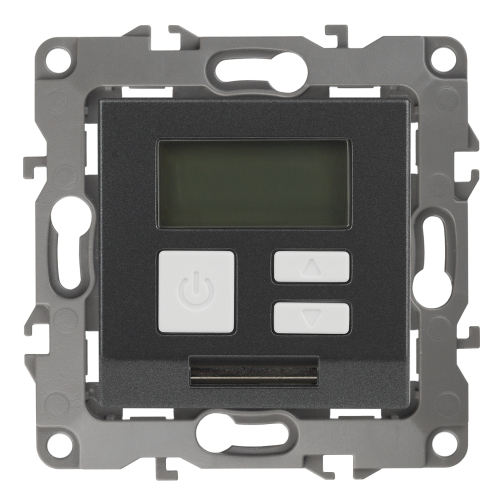 Терморегулятор теплый пол / отопление электронный серии Эра 12 СУ механизм цвет графит 12-4111-12. Номинальные характеристики 16А 230В. Сделана из поликарбоната. Монтаж в подрозетник производится и на лапки, и на винты. Рамки приобретаются отдельно. Рамки Эра 12: 1 пост 12-5001-хх, 2 поста 12-5002-хх, 3 поста 12-5003-хх, 4 поста 12-5004-хх, 5 постов 12-5005-хх. Рамки Эра 12 Сатин: 1 пост 12-5101-хх, 2 поста 12-5102-хх, 3 поста 12-5103-хх, 4 поста 12-5104-хх, 5 постов - 12-5105-хх (хх - код цвета: 01-белый, 02-слоновая кость, 03-алюминий, 04-шампань, 05-антрацит, 06-чёрный, 07-ольха(белёный дуб-сатин), 08-вишня, 09-дуб, 10-венге, 11-сосна, 21-жёлтый, 22-оранжевый, 23-красный, 24-охра, 25-бордо, 26-лайм, 27-зелёный, 28-голубой, 29-синий).
