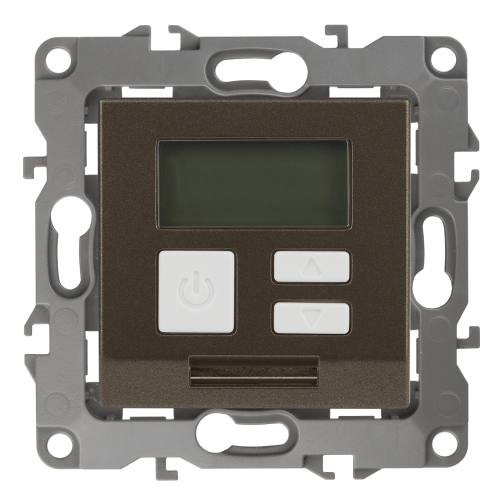 Терморегулятор теплый пол / отопление электронный серии Эра 12 СУ механизм цвет бронза 12-4111-13. Номинальные характеристики 16А 230В. Сделана из поликарбоната. Монтаж в подрозетник производится и на лапки, и на винты. Рамки приобретаются отдельно. Рамки Эра 12: 1 пост 12-5001-хх, 2 поста 12-5002-хх, 3 поста 12-5003-хх, 4 поста 12-5004-хх, 5 постов 12-5005-хх. Рамки Эра 12 Сатин: 1 пост 12-5101-хх, 2 поста 12-5102-хх, 3 поста 12-5103-хх, 4 поста 12-5104-хх, 5 постов - 12-5105-хх (хх - код цвета: 01-белый, 02-слоновая кость, 03-алюминий, 04-шампань, 05-антрацит, 06-чёрный, 07-ольха(белёный дуб-сатин), 08-вишня, 09-дуб, 10-венге, 11-сосна, 21-жёлтый, 22-оранжевый, 23-красный, 24-охра, 25-бордо, 26-лайм, 27-зелёный, 28-голубой, 29-синий).