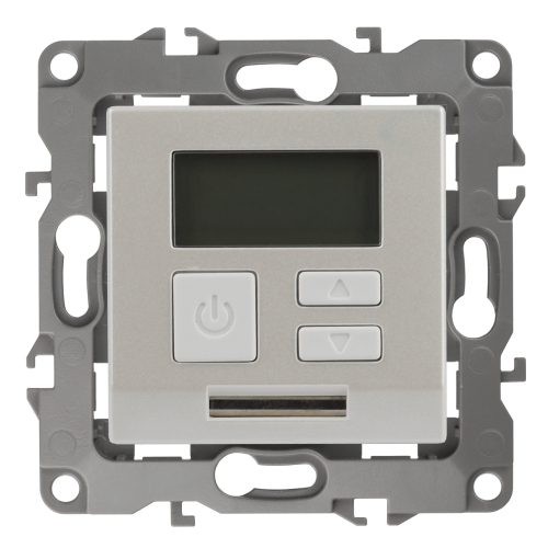 Терморегулятор теплый пол / отопление электронный серии Эра 12 СУ механизм цвет перламутр 12-4111-15. Номинальные характеристики 16А 230В. Сделана из поликарбоната. Монтаж в подрозетник производится и на лапки, и на винты. Рамки приобретаются отдельно. Рамки Эра 12: 1 пост 12-5001-хх, 2 поста 12-5002-хх, 3 поста 12-5003-хх, 4 поста 12-5004-хх, 5 постов 12-5005-хх. Рамки Эра 12 Сатин: 1 пост 12-5101-хх, 2 поста 12-5102-хх, 3 поста 12-5103-хх, 4 поста 12-5104-хх, 5 постов - 12-5105-хх (хх - код цвета: 01-белый, 02-слоновая кость, 03-алюминий, 04-шампань, 05-антрацит, 06-чёрный, 07-ольха(белёный дуб-сатин), 08-вишня, 09-дуб, 10-венге, 11-сосна, 21-жёлтый, 22-оранжевый, 23-красный, 24-охра, 25-бордо, 26-лайм, 27-зелёный, 28-голубой, 29-синий).