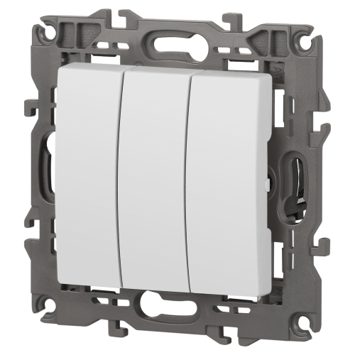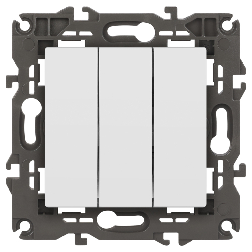 Выключатель 3-клавишный Эра Elegance белый 14-1107-01. Рамки приобретаются отдельно. Рамки Эра Elegance ПЛАСТИК: 1 пост 14-5001-хх, 2 поста 14-5002-хх, 3 поста 14-5003-хх, 4 поста 14-5004-хх, 5 постов 14-5005-хх; СТЕКЛО: 1 пост 14-5101-хх, 2 поста 14-5102-хх, 3 поста 14-5103-хх, 4 поста 14-5104-хх; МЕТАЛЛ: 1 пост 14-5201-хх, 2 поста 14-5202-хх, 3 поста 14-5203-хх, 4 поста 14-5204-хх; ДЕРЕВО: 1 пост 14-5301-хх, 2 поста 14-5302-хх, 3 поста 14-5303-хх, 4 поста 14-5304-хх (хх - код цвета: 00-прозрачный, 01-белый, белёный дуб, 02-слоновая кость, 03-алюминий, 04-шампань, 05-чёрный, чёрное дерево, 07-ясень, 09-дуб, 10-венге, 11-клён, 14-медь, 21-жёлтый, 22-оранжевый, 23-красный, 25-бордо, 26-лайм, 27-зелёный, 28-голубой, 29-синий, 30-розовый, 31-мокко, 32-серый, 41-сталь, 42-титан).