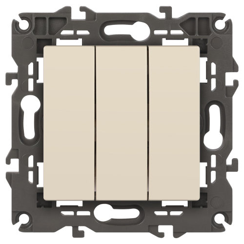 Выключатель 3-клавишный Эра Elegance слоновая кость 14-1107-02. Рамки приобретаются отдельно. Рамки Эра Elegance ПЛАСТИК: 1 пост 14-5001-хх, 2 поста 14-5002-хх, 3 поста 14-5003-хх, 4 поста 14-5004-хх, 5 постов 14-5005-хх; СТЕКЛО: 1 пост 14-5101-хх, 2 поста 14-5102-хх, 3 поста 14-5103-хх, 4 поста 14-5104-хх; МЕТАЛЛ: 1 пост 14-5201-хх, 2 поста 14-5202-хх, 3 поста 14-5203-хх, 4 поста 14-5204-хх; ДЕРЕВО: 1 пост 14-5301-хх, 2 поста 14-5302-хх, 3 поста 14-5303-хх, 4 поста 14-5304-хх (хх - код цвета: 00-прозрачный, 01-белый, белёный дуб, 02-слоновая кость, 03-алюминий, 04-шампань, 05-чёрный, чёрное дерево, 07-ясень, 09-дуб, 10-венге, 11-клён, 14-медь, 21-жёлтый, 22-оранжевый, 23-красный, 25-бордо, 26-лайм, 27-зелёный, 28-голубой, 29-синий, 30-розовый, 31-мокко, 32-серый, 41-сталь, 42-титан).