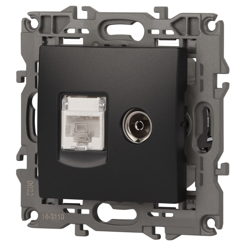Розетка телевизионная + интернет серии Эра Elegance цвет антрацит 14-3110-05. Рамки приобретаются отдельно. Рамки Эра Elegance ПЛАСТИК: 1 пост 14-5001-хх, 2 поста 14-5002-хх, 3 поста 14-5003-хх, 4 поста 14-5004-хх, 5 постов 14-5005-хх; СТЕКЛО: 1 пост 14-5101-хх, 2 поста 14-5102-хх, 3 поста 14-5103-хх, 4 поста 14-5104-хх; МЕТАЛЛ: 1 пост 14-5201-хх, 2 поста 14-5202-хх, 3 поста 14-5203-хх, 4 поста 14-5204-хх; ДЕРЕВО: 1 пост 14-5301-хх, 2 поста 14-5302-хх, 3 поста 14-5303-хх, 4 поста 14-5304-хх (хх - код цвета: 00-прозрачный, 01-белый, белёный дуб, 02-слоновая кость, 03-алюминий, 04-шампань, 05-чёрный, чёрное дерево, 07-ясень, 09-дуб, 10-венге, 11-клён, 14-медь, 21-жёлтый, 22-оранжевый, 23-красный, 25-бордо, 26-лайм, 27-зелёный, 28-голубой, 29-синий, 30-розовый, 31-мокко, 32-серый, 41-сталь, 42-титан).