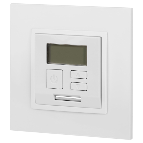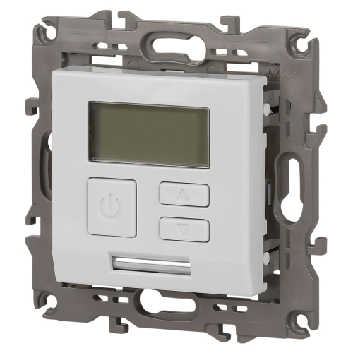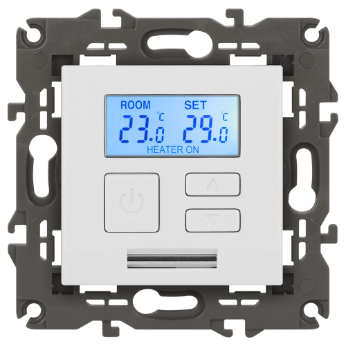 Терморегулятор теплый пол / отопление электронный серии Эра Elegance цвет белый 14-4111-01. Рамки приобретаются отдельно. Рамки Эра Elegance ПЛАСТИК: 1 пост 14-5001-хх, 2 поста 14-5002-хх, 3 поста 14-5003-хх, 4 поста 14-5004-хх, 5 постов 14-5005-хх; СТЕКЛО: 1 пост 14-5101-хх, 2 поста 14-5102-хх, 3 поста 14-5103-хх, 4 поста 14-5104-хх; МЕТАЛЛ: 1 пост 14-5201-хх, 2 поста 14-5202-хх, 3 поста 14-5203-хх, 4 поста 14-5204-хх; ДЕРЕВО: 1 пост 14-5301-хх, 2 поста 14-5302-хх, 3 поста 14-5303-хх, 4 поста 14-5304-хх (хх - код цвета: 00-прозрачный, 01-белый, белёный дуб, 02-слоновая кость, 03-алюминий, 04-шампань, 05-чёрный, чёрное дерево, 07-ясень, 09-дуб, 10-венге, 11-клён, 14-медь, 21-жёлтый, 22-оранжевый, 23-красный, 25-бордо, 26-лайм, 27-зелёный, 28-голубой, 29-синий, 30-розовый, 31-мокко, 32-серый, 41-сталь, 42-титан).