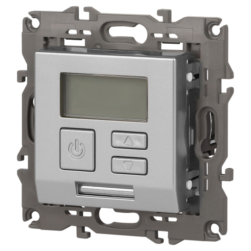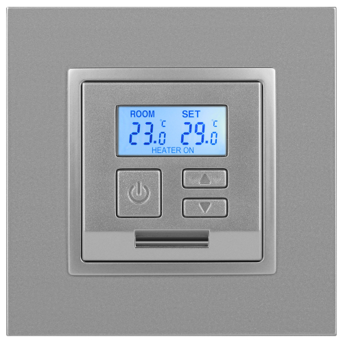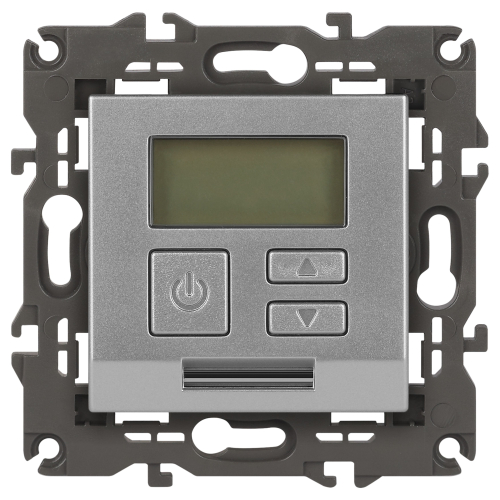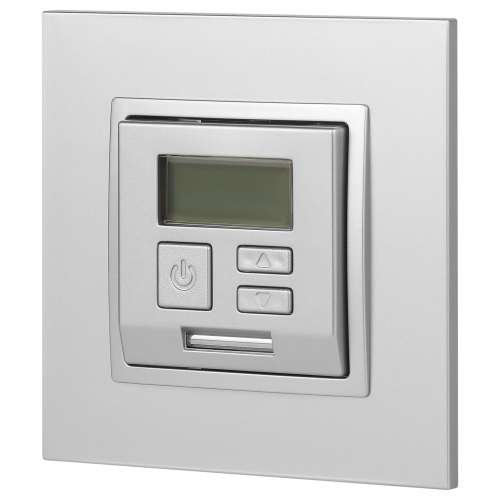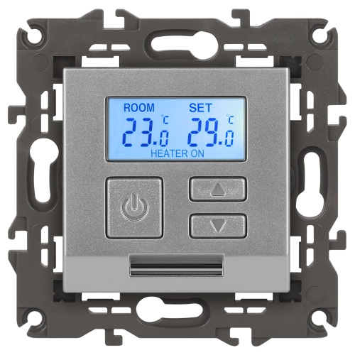 Терморегулятор теплый пол / отопление электронный серии Эра Elegance цвет алюминий 14-4111-03. Рамки приобретаются отдельно. Рамки Эра Elegance ПЛАСТИК: 1 пост 14-5001-хх, 2 поста 14-5002-хх, 3 поста 14-5003-хх, 4 поста 14-5004-хх, 5 постов 14-5005-хх; СТЕКЛО: 1 пост 14-5101-хх, 2 поста 14-5102-хх, 3 поста 14-5103-хх, 4 поста 14-5104-хх; МЕТАЛЛ: 1 пост 14-5201-хх, 2 поста 14-5202-хх, 3 поста 14-5203-хх, 4 поста 14-5204-хх; ДЕРЕВО: 1 пост 14-5301-хх, 2 поста 14-5302-хх, 3 поста 14-5303-хх, 4 поста 14-5304-хх (хх - код цвета: 00-прозрачный, 01-белый, белёный дуб, 02-слоновая кость, 03-алюминий, 04-шампань, 05-чёрный, чёрное дерево, 07-ясень, 09-дуб, 10-венге, 11-клён, 14-медь, 21-жёлтый, 22-оранжевый, 23-красный, 25-бордо, 26-лайм, 27-зелёный, 28-голубой, 29-синий, 30-розовый, 31-мокко, 32-серый, 41-сталь, 42-титан).