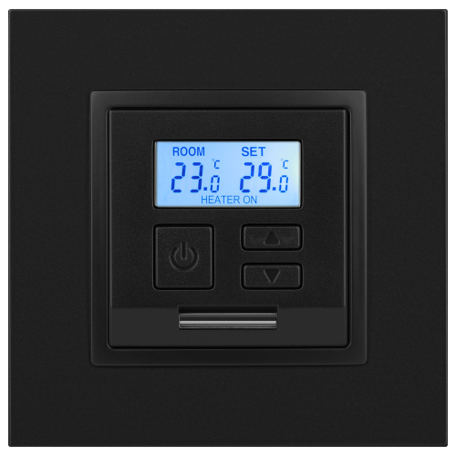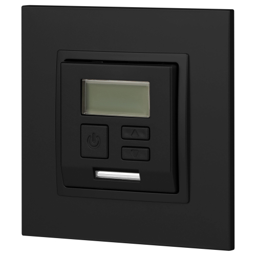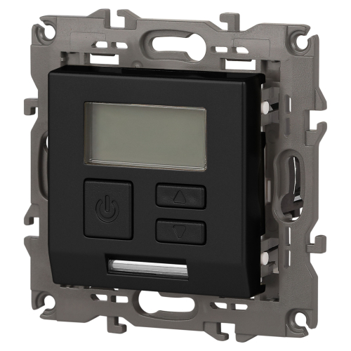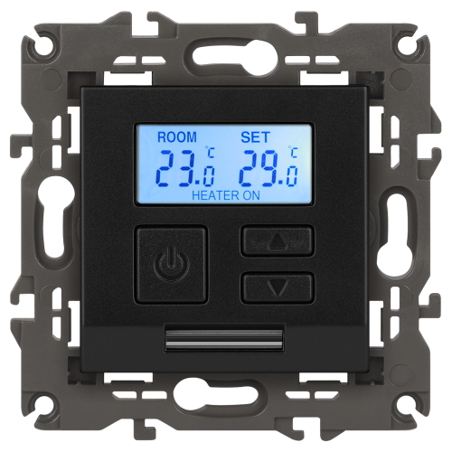 Терморегулятор теплый пол / отопление электронный серии Эра Elegance цвет антрацит 14-4111-05. Рамки приобретаются отдельно. Рамки Эра Elegance ПЛАСТИК: 1 пост 14-5001-хх, 2 поста 14-5002-хх, 3 поста 14-5003-хх, 4 поста 14-5004-хх, 5 постов 14-5005-хх; СТЕКЛО: 1 пост 14-5101-хх, 2 поста 14-5102-хх, 3 поста 14-5103-хх, 4 поста 14-5104-хх; МЕТАЛЛ: 1 пост 14-5201-хх, 2 поста 14-5202-хх, 3 поста 14-5203-хх, 4 поста 14-5204-хх; ДЕРЕВО: 1 пост 14-5301-хх, 2 поста 14-5302-хх, 3 поста 14-5303-хх, 4 поста 14-5304-хх (хх - код цвета: 00-прозрачный, 01-белый, белёный дуб, 02-слоновая кость, 03-алюминий, 04-шампань, 05-чёрный, чёрное дерево, 07-ясень, 09-дуб, 10-венге, 11-клён, 14-медь, 21-жёлтый, 22-оранжевый, 23-красный, 25-бордо, 26-лайм, 27-зелёный, 28-голубой, 29-синий, 30-розовый, 31-мокко, 32-серый, 41-сталь, 42-титан).