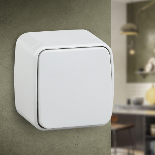 Проходной выключатель (переключатель) 1-клавишный серии Intro Polo открытой установки цвет белый 3-103-01. Номинальные характеристики 10А 250В . Выключатель выполнен из качественного термопласта, стали и латуни, оснащён винтовыми зажимами.
