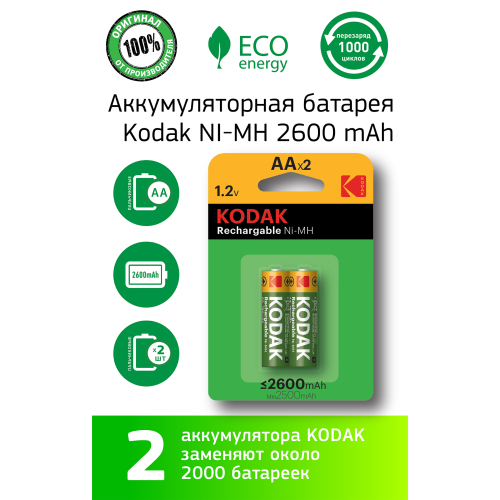 Наши аккумуляторные батарейки (Никель-металлогидридные аккумуляторы) KODAK - отличный способ сохранить окружающую среду. Эти батарейки можно перезаряжать более 2000 раз, это отличный способ спасти планету и уменьшить количество мусорных свалок. Используйте наше зарядное устройство для дома, чтобы восстановить энергию ваших аккумуляторов. Характеристики: Отлично подходят для: игровых контроллеров, цифровых камер, дронов
