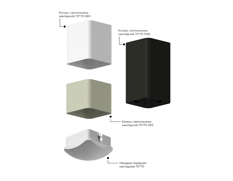 Коллекция DIY Spot предназначена для создания эксклюзивных светильников, под каждый стиль и интерьер. В многочисленных моделях данной коллекции вы сможете подобрать корпус, любого цвета, текстуры и размера, монтаж которого может быть как накладным, так и встраиваемым. К корпусу, вы сможете подобрать декоративные передние насадки, задние насадки, при помощи которых накладной светильник легко поменять на подвесной или трековый. Так же, в коллекцию DIY Spot входят коннекторы, которые дают возможность создания больших вариантов комплектаций. Для корпуса, с размером отверстия 70мм*70мм, подойдут насадки с размером 70мм*70мм. К данным моделям подойдет лампа MR16.