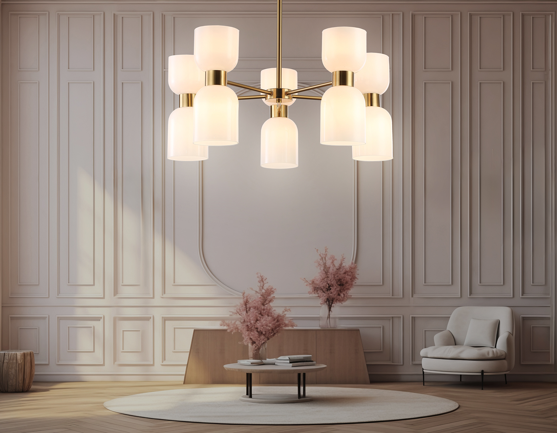 Люстра на штанге из коллекции HIGH LIGHT. Модель LH56093 представлена в стиле модерн. Люстра выполнена из плафонов белого матового стекла и металлического каркаса цвета латунь. Для данной модели подойдут лампы с цоколем Е14. Люстра будет прекрасным дополнением в любом помещении.