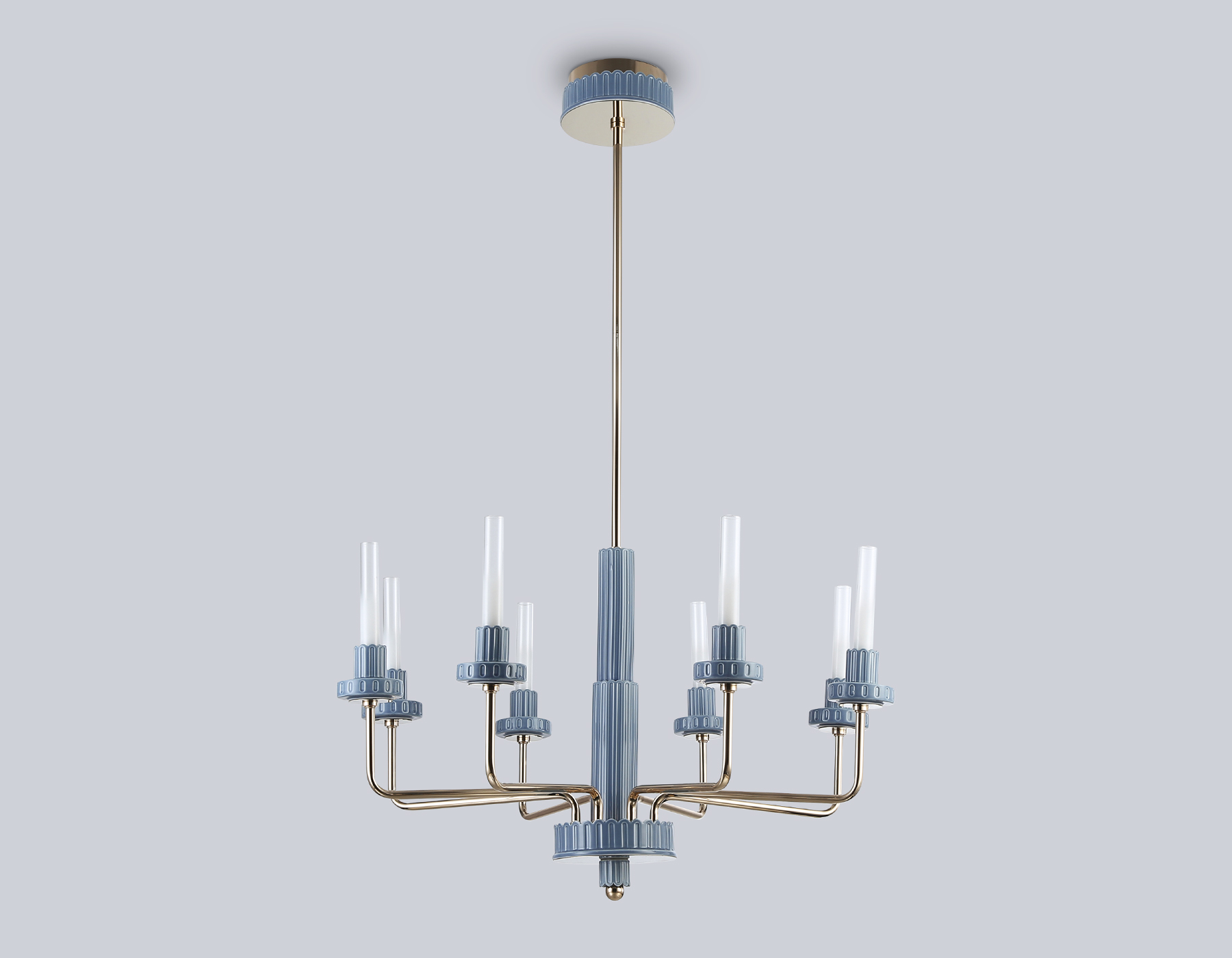 Светодиодная люстра на штанге из коллекции HIGH LIGHT. Модель LH53126 представлена в стиле модерн. Светильник выполнен из металлического каркаса золотого цвета, плафонов из стекла белого градиента и декорирована элементами из серо-синего фарфора. Эта модель оснащена встроенными светодиодами, благодаря чему вы забудете о замене дополнительных ламп. Светильник будет прекрасным дополнением в любом помещении.