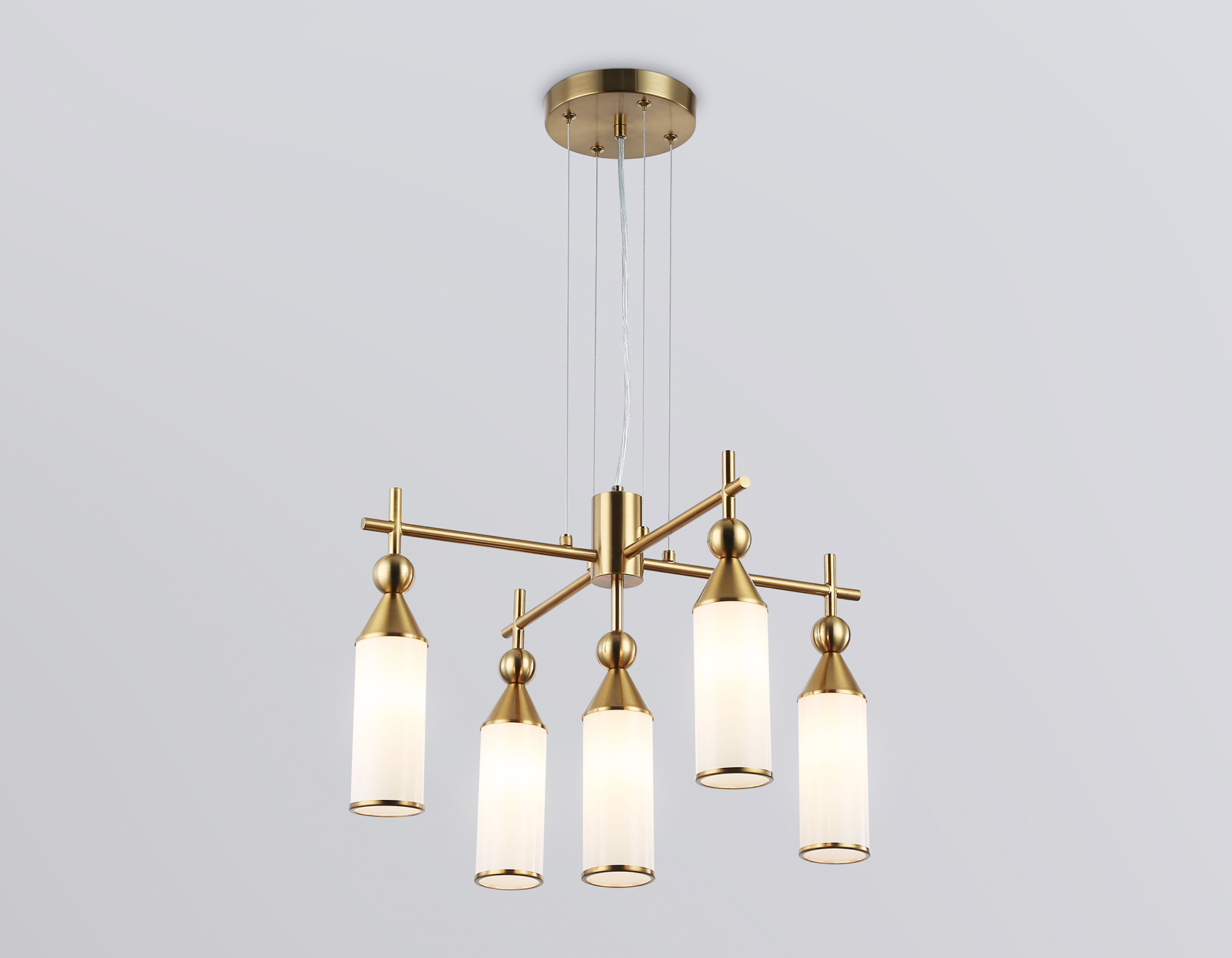 Подвесная люстра из коллекции HIGH LIGHT. Модель LH55276 представлена в стиле модерн. Люстра выполнена из плафонов белого матового стекла и металлического каркаса цвета латунь. Для данной модели подойдут лампы с цоколем Е14. Люстра будет прекрасным дополнением в любом помещении.