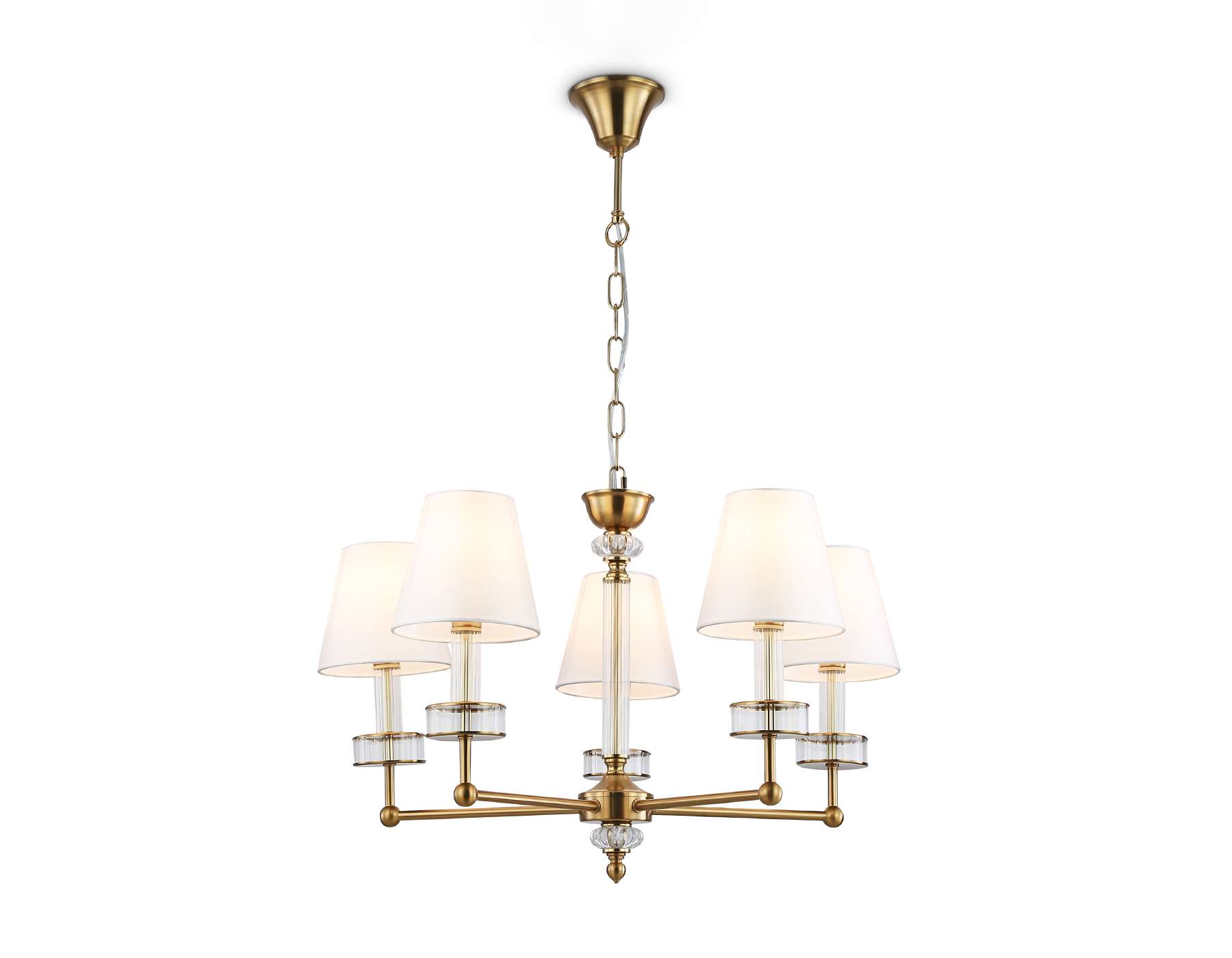 Подвесная люстра с абажурами и хрусталем из коллекции HIGH LIGHT. Модель LH71021 представлена в стиле неоклассика. Люстра выполнена из металла цвета латунь, тканевых плафонов белого цвета и декорирована превосходным прозрачным хрусталем. Для данной модели подойдут лампы с цоколем Е14. Люстра будет прекрасным дополнением в любом помещении.