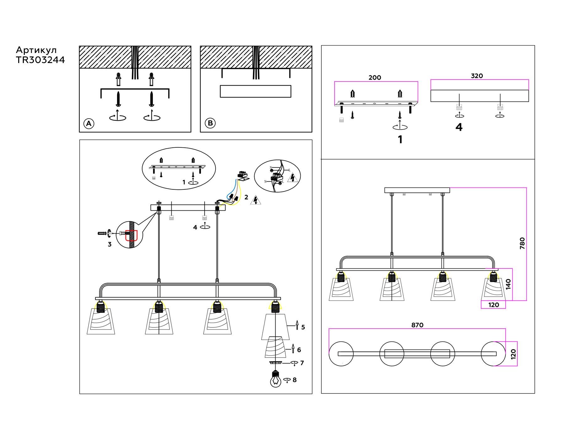 TR303244/4 BK/CH/SM/FR черный/хром/дымчатый/белый матовый E27*4 max 60W 870*120*780