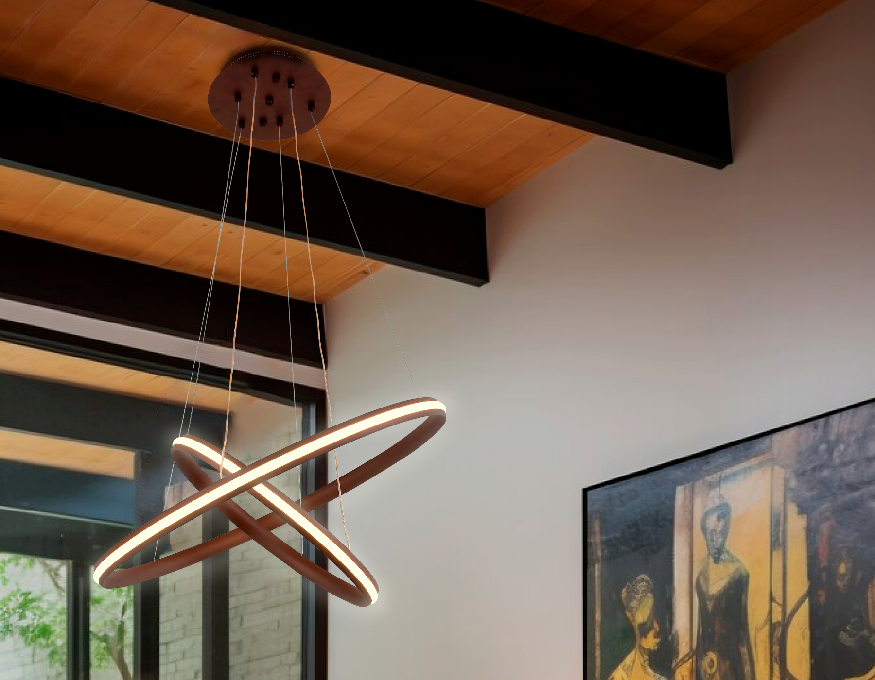 Ультрасовременная подвесная светодиодная люстра, коллекция COMFORT. Модель FL406 выполнена в современном стиле хай-тек. Люстра выполнена в форме двух металлических колец, кофейного цвета. Эта модель оснащена встроенными светодиодами, благодаря чему вы забудете о замене дополнительных ламп. Так же с помощью радиоуправляемого пульта вы сможете регулировать цветовую температуру, яркость освещения и ночной режим. Эта модель подходит для натяжных потолков и будет прекрасным дополнением в гостиной, спальне или детской комнате.