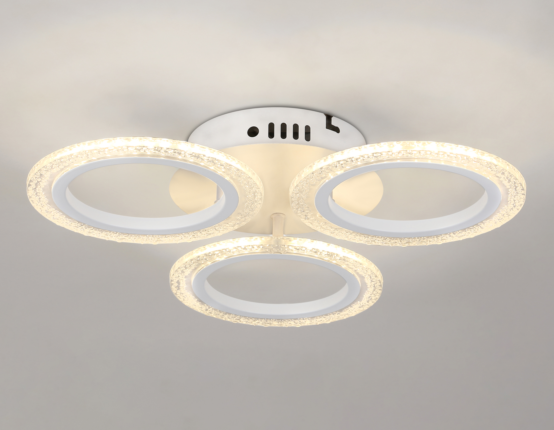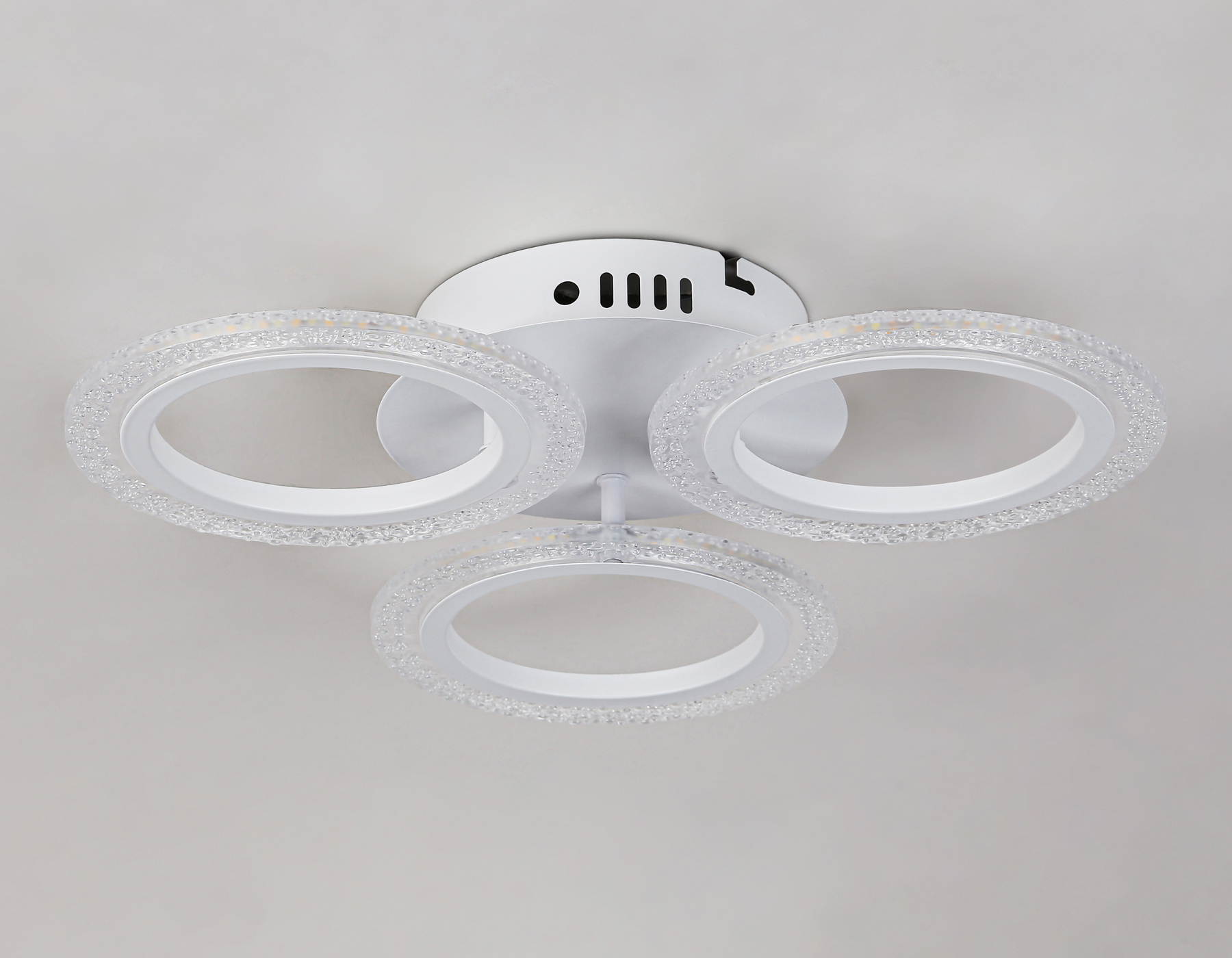 Современный потолочный светодиодный светильник, коллекция ACRYLICA. Модель FA4050 представлена в современном стиле Неоклассика. Светильник выполнен в белом цвете, круглой формы, состоит из 3 акриловых плафонов на металлическом каркасе. Эта модель оснащена встроенными светодиодами, благодаря чему вы забудете о замене дополнительных ламп. Так же с помощью инфракрасного пульта вы сможете регулировать цветовую температуру, яркость освещения и ночной режим. Данная модель подходит для натяжных потолков и будет прекрасным дополнением в любом помещении.