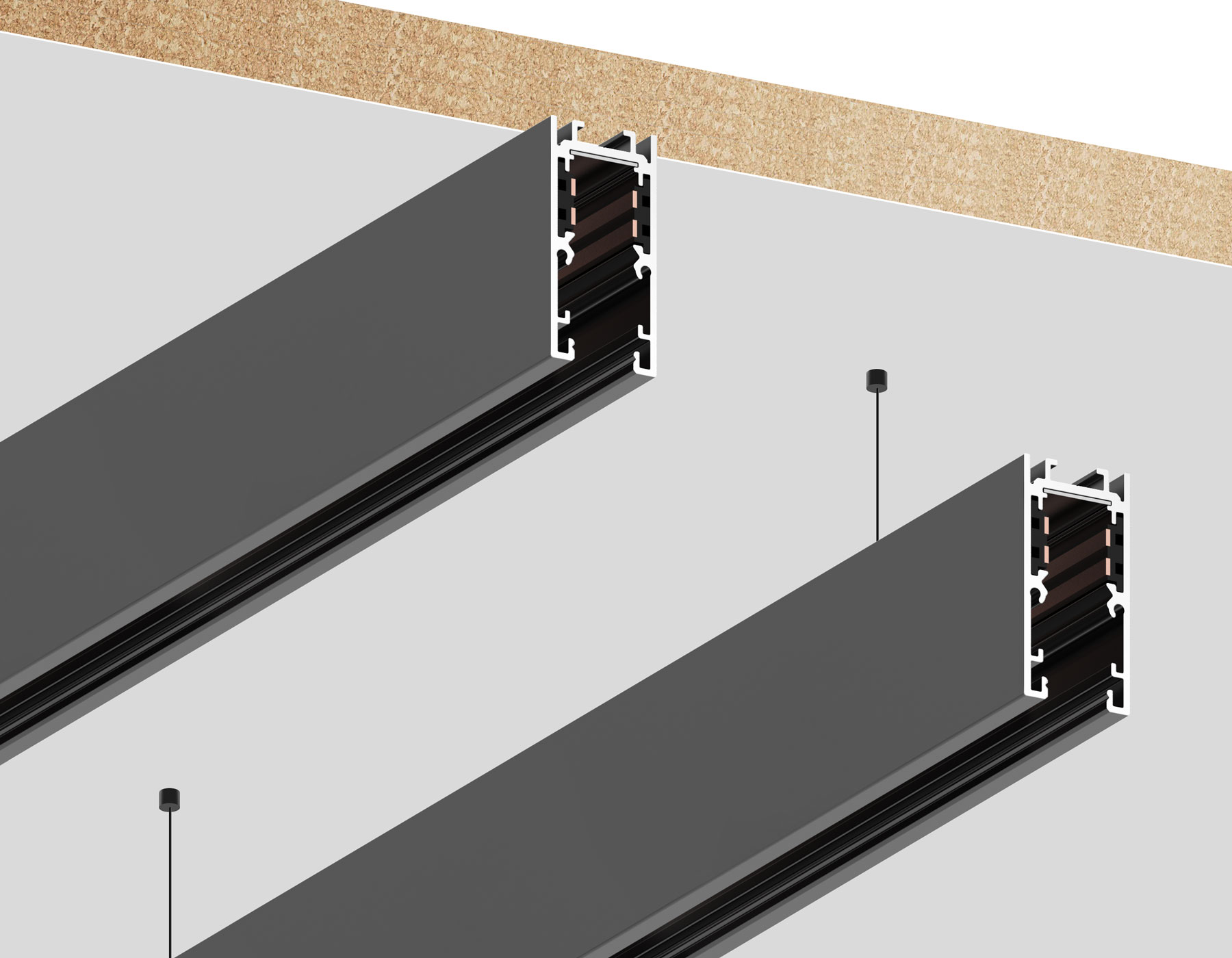 Трековые системы Magnetic standard 48V 10mm для накладного монтажа может крепиться к потолку накладным способом с помощью крепежа (GL1995), подвешиваться с помощью подвесов (GL1999). Шинопровод подключается и работает через блок питания 48V. Декоративный экран, торцевые заглушки идут в комплекте. Дополнительные аксессуары: блок питания, подвод питания, соединительные элементы приобретаются отдельно.