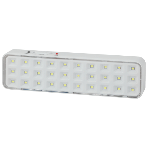 Светильник аварийный светодиодный для освещения путей эвакуации, коридоров, проходов, запасных дверей; как эвакуационные или указательные светильники (при наличии пиктограмм).; 2 режима работы; время автономной работы 300 минут; наличие кнопки "ТЕСТ" для проверки работы в аварийном режиме. Гарантия:3 года.Диапазон рабочих температур:(+1+35). Класс энергоэффективности:A. Климатическое исполнение:УХЛ4. Преимущества:2 режима работы; время автономной работы 300 минут; наличие кнопки "ТЕСТ" для проверки работы в аварийном режиме; наклейка "ВЫХОД" в комплекте.Цветовая температура:6500K. Материал корпуса:пластик. Габариты: 202x56x30мм. Потребляемая мощность:3Вт. Степень защиты от окружающей среды:IP20. Тип рассеивателя: прозрачный. Тип кривой: Д. Питающее напряжение светильника: 230Вт.