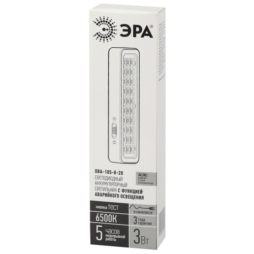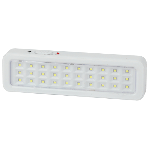 Светильник аварийный светодиодный. Область применения: Предназначен для освещения путей эвакуации, коридоров, проходов, запасных дверей; как эвакуационные или указательные светильники (при наличии пиктограмм). Световой поток 150Лм Режим работы от сети 230В, от аккумулятора. Номинальное время автономной работы 3 часа. Наличие кнопки "ТЕСТ" для проверки работы в аварийном режиме. Гарантия:3 года.Диапазон рабочих температур:(+1+35). Класс энергоэффективности:A. Климатическое исполнение:УХЛ4. Цветовая температура:6500K. Материал корпуса:пластик. Габариты: 202x57x30мм. Потребляемая мощность:3Вт. Степень защиты от окружающей среды:IP20. Тип рассеивателя: прозрачный. Тип кривой: Д.