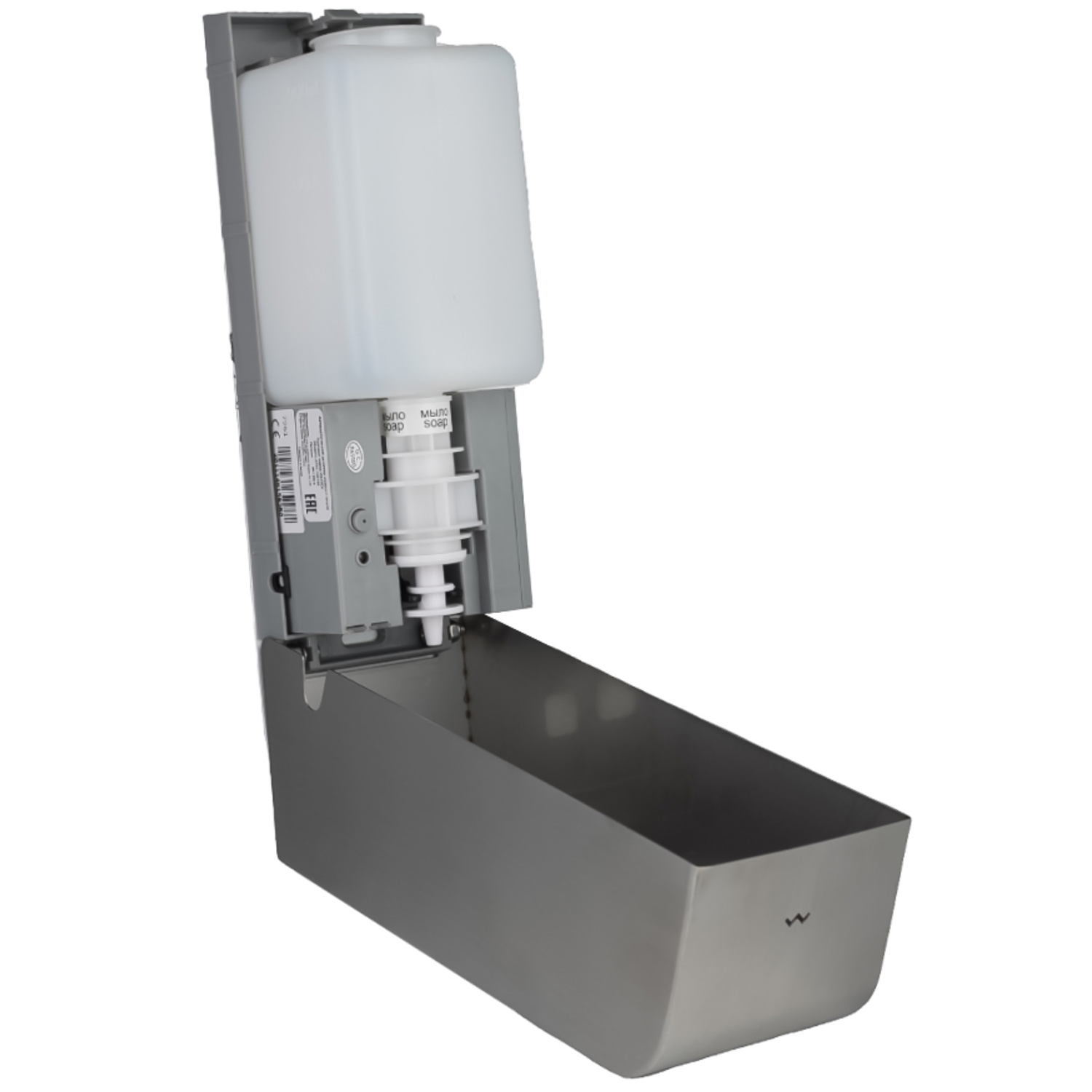 Автоматический дозатор жидкого мыла выполнен из матовой нержавеющей стали.