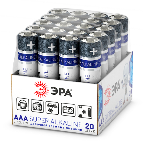 Щелочные (алкалиновые) батарейки ЭРА в удобной брендированной упаковке на 20 штук. Мизинчиковые батарейки (ААА) - популярные элементы питания. Активно применяются во множестве устройств, окружающих человека в быту, на работе, на отдыхе. Мизинчиковые алкалиновые батарейки ЭРА LR03-20 SUPER Alkaline станут надёжным поставщиком энергии для пультов дистанционного управления, камер видеонаблюдения, фонарей, радиоприёмников, портативных колонок, переносных светильников и многих других устройств небольшого размера. Элементы питания ЭРА - пример отличного сочетания качества и цены. Обладают оптимальной емкостью, хорошо переносят низкие температуры.