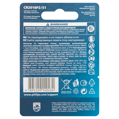 • Тип элемента питания: Батарея - "пуговица" / литиевая