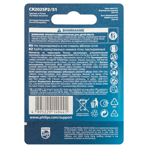 • Тип элемента питания: Батарея - "пуговица" / литиевая