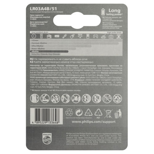 • Щелочные батареи Philips содержат 0 % кадмия, ртути и свинца