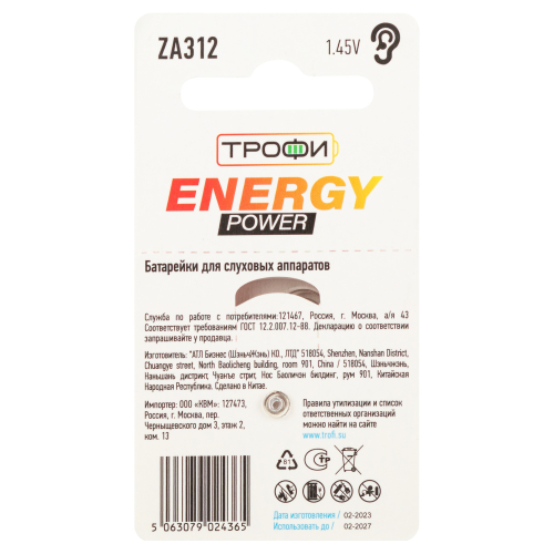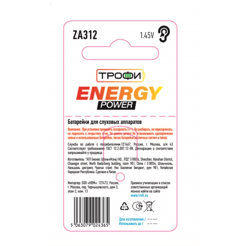 Батарейки Трофи ZA312-6BL воздушно-цинковые для слухового аппарата.