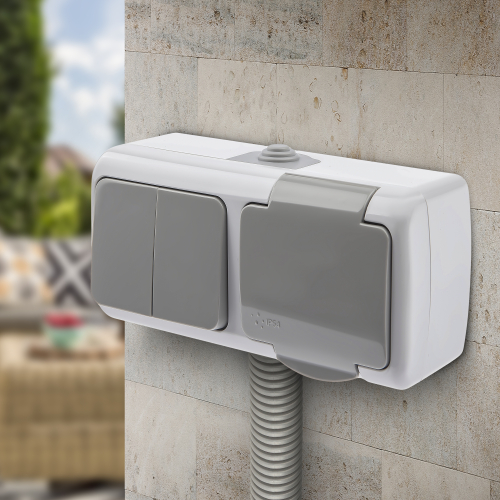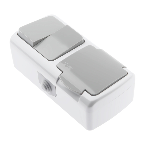 Блок розетка 2P+E + выключатель двойн., 10(16)А-250В, ОУ, Atlantic, IP54, серый