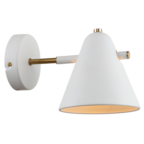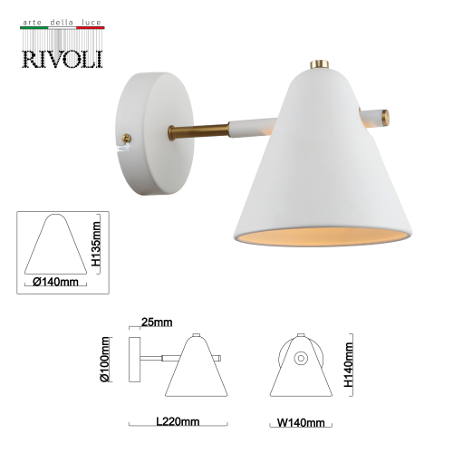 Бра настенное Rivoli выполнено из металла, гальванизировано в белый цвет, имеет декоративные части золотого оттенка. Конусообразный плафон бра направлен вниз, что обеспечивает яркую подсветку для чтения, подсветку столешницы, подсветку прикроватной тумбы. Лампа для светильника-бра – Е14 40 Вт. Освещаемая площадь бра – до 3 м2. Бра в стиле лофт, бра в стиле модерн Rivoli – выбор профессиональных дизайнеров интерьеров!