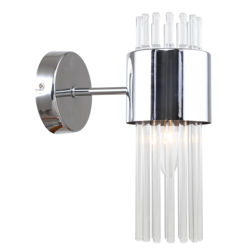 Бра настенное в цвете хром, с цилиндрическим плафоном из прозрачных стеклянных трубочек. Источник света для данного бра – лампа Е14 40 Вт (приобретается отдельно). Светильник настенный Rivoli (арт. 3148-401) создаёт яркое дополнительное освещение. Размеры бра: 190*100*260 мм. К данному светильнику настенному можно купить люстры аналогичного дизайна: арт. 3148-305 – под 5 ламп, арт. 3148-307 – под 7 ламп. Коллекцию дополняет светильник подвесной – арт. 3148-201.