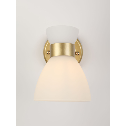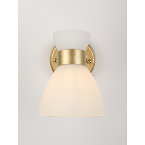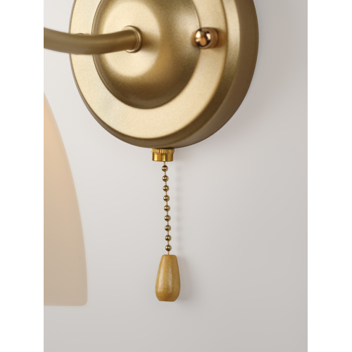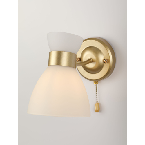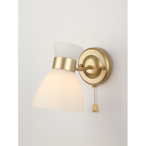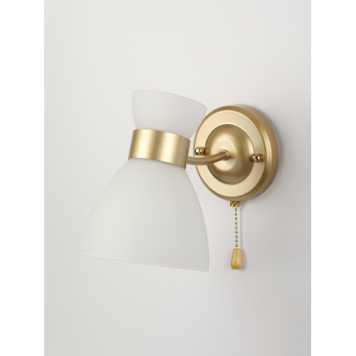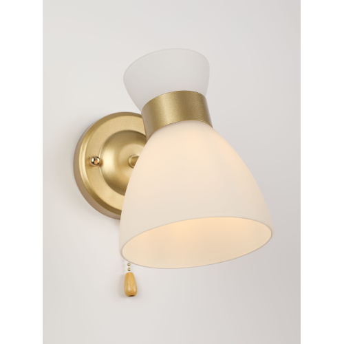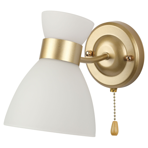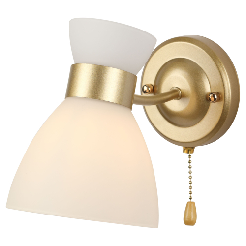 Золотой настенный светильник с опаловым плафоном — практичное и стильное решение в духе современной классики. Бра оснащено удобным выключателем-цепочкой. Подходят лампы с цоколем E27, мощностью до 60 Вт (лампа в комплект не входит).