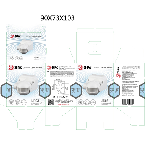 ЭРА MD 03 Датчик движения инфракрасный настенный позволяет производить автоматическое включение осветительных приборов, питающихся от сети 220 В, при появлении движущегося объекта в зоне обнаружения датчика. Благодаря этому , а также наличию регулировки времени задержки выключения и настройки чувствительности к внешней освещенности, обеспечивается экономия не только вашего времени, но и денег за счет разумной Экономии электроэнергии.