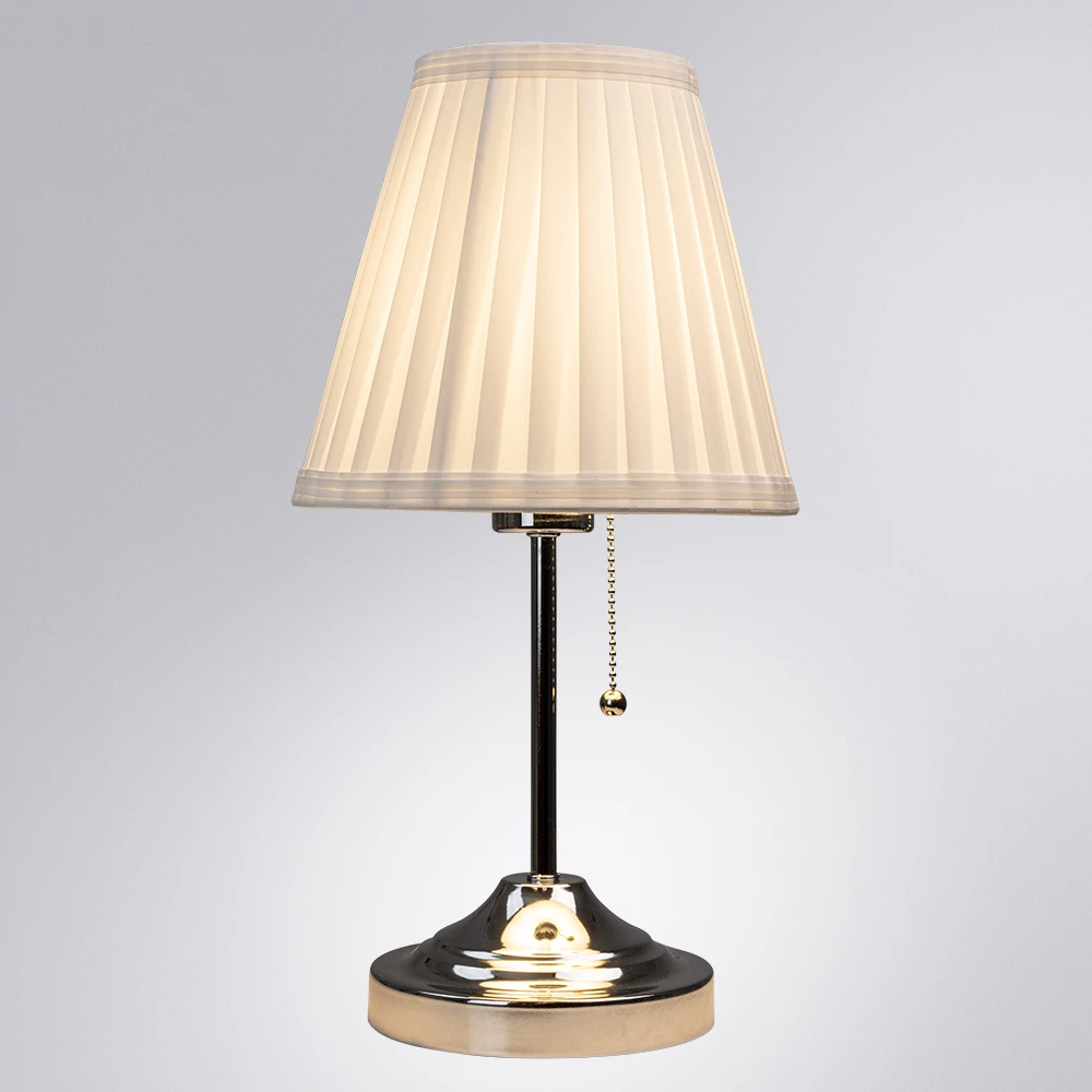 Настольная лампа Arte Lamp MARRIOT A5039TL-1CC в стиле неоклассика. Плафон из белого текстиля направляет свет вверх, создавая мягкое рассеянное освещение. Изящная металлическая арматура хромированного цвета добавляет интерьеру элегантности. Лампа подходит для использования со светодиодными лампами и лампами накаливания. Идеальное решение для организации комфортного рабочего места или уютного уголка для чтения.
