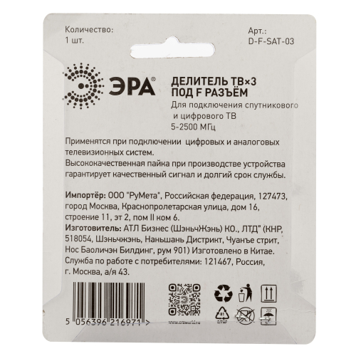 Телевизионный делитель используется в частных и много квартирах домах для подключения нескольких телевизионных аппаратов к одной антенне. Для установки не требуются специальный инструмент и профессиональные навыки. ТВ делители ЭРА отличает от других производителе высокое качество применяемых материалов, сборки и защита от электромагнитных помех.
