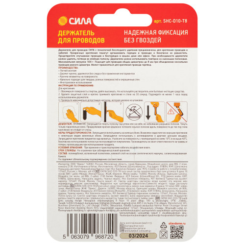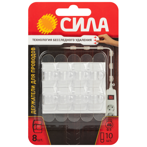 Держатели для проводов СИЛА с технологией бесследного удаления предназначены для крепления проводов и кабелей. Прозрачные крепления помогут организовать порядок в проводах и безопасно их разместить. Предотвратите спутывание проводов и беспорядок в вашем доме или офисе. При необходимости держатели можно удалить, потянув за клейкую полоску. Держатели можно использовать повторно со сменными полосками. Максимальная нагрузка: 500 г. Подходят для проводов диаметром до 8 мм, а также объединения нескольких проводов разного диаметра. Может применяться для крепления крупных гирлянд.