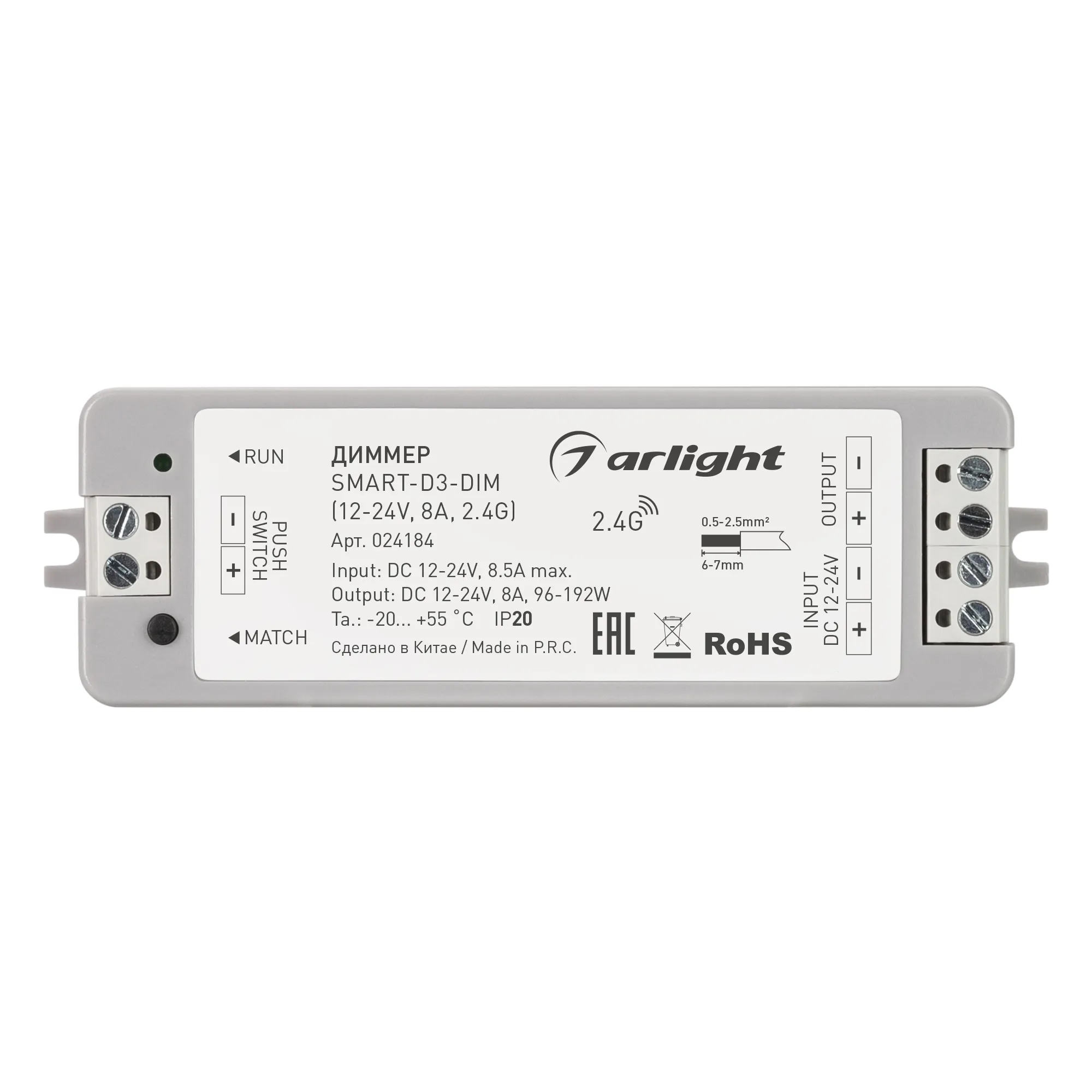 Диммер для управления одноцветной светодиодной лентой по ШИМ и другими светодиодными источниками света с напряжением питания 12-24В. Выполняет основные фукнции: включение/выключение, регулировка яркости. Устройство совместимо с радиочастотными пультами дистанционного управления и настенными панелями управления серии SMART. Возможна привязка до 10 пультов или панелей управления. Питание от 12-24В, максимальная нагрузка 8А, выходная мощность 96-192 Вт (в зависимости от напряжения питания). Габариты устройства 97x33x18 мм.