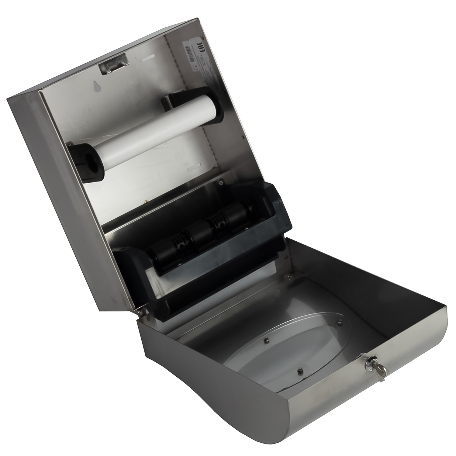 Диспенсер рулонных полотенец выполнен из матовой нержавеющей стали.