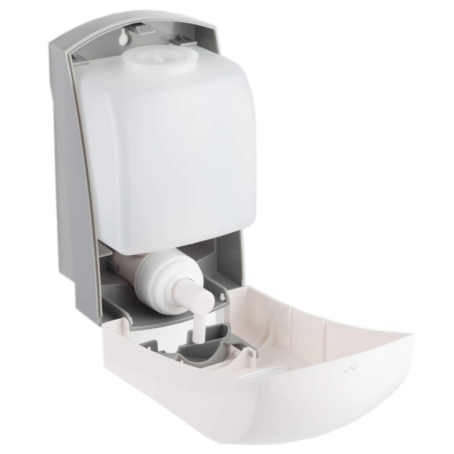 Диспенсер для пены выполнен из белого пластика.