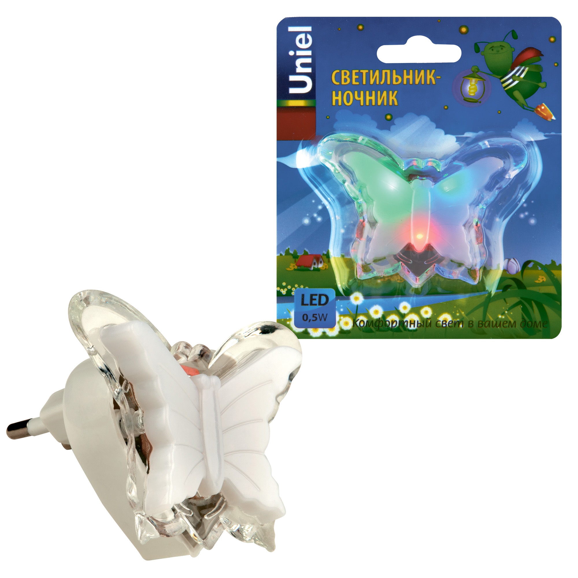 Светильник-ночник детской серии DTL-308-Бабочка/RGB/3LED/0,5W без выключателя предназначен для дополнительной подсветки в помещении. Светодиодый ночник - популярный выбор многих покупателей, компактный и удобный. Светильник подарит атмосферу уюта и настроит на спокойный сон. Модель отлично подойдет в детскую комнату. Корпус светильника-ночника изготовлен из пластика, цвет свечения - многоцветный (красный, синий, зеленый), выполнен в форме бабочки. Количество светодиодов - 3 шт. Мощность 0,5 Вт. Степень пылевлагозащиты IP20. Требуется подключение к сети. Размер упаковки - ДхШхВ 50х105х125 мм. Общий вес - 33 г. Гарантия от производителя - 1 год. Срок службы - 50000 часов.